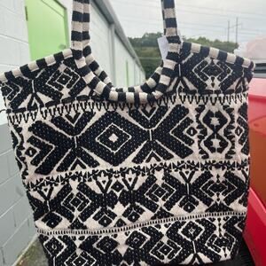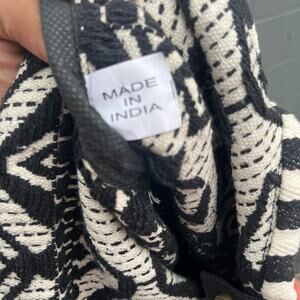 Stylish and versatile, this black and white patterned tote bag is perfect for any occasion. Its bold design adds a touch of elegance to your outfit. Made in India, Preloved.
