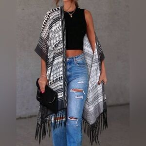 Elevate your style with this chic black and white patterned Kimino. Perfect for any occasion, this Kimino offers both comfort and elegance.