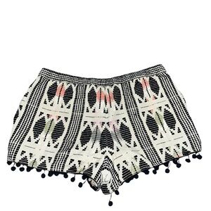 Stylish black and white patterned shorts with playful pom-pom trim. Perfect for casual outings and summer days.