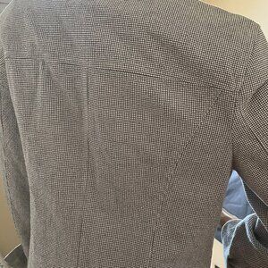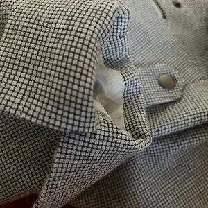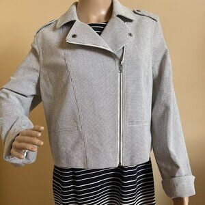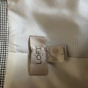 Ann Taylor Loft jacket with brushed silver snaps and zipper. Faux pockets. Size L. Shell: 80%cotton, 12% polyester, 7% rayon, 1% spandex. White lining: 100% polyester. Machine wash.