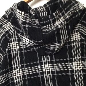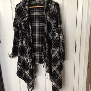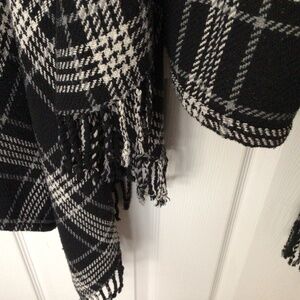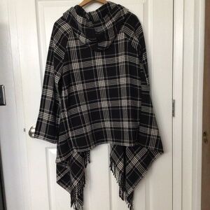 Black and White Plaid Wrap Sweater with Hood and Fringe