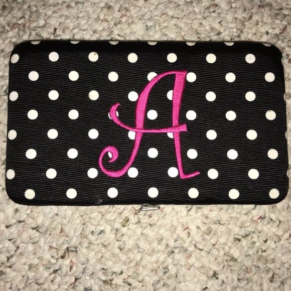 Black and White Polka Dot Initial A wallet. Some of the dots aren't perfectly white