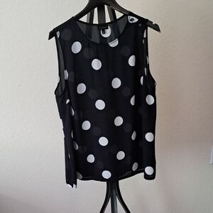 Chic sleeveless top featuring a classic black and white polka dot pattern. Perfect for any occasion.