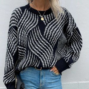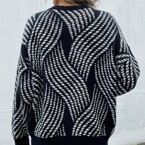 Black and White Preppy Womens Allover Pattern Drop Shoulder Sweater