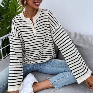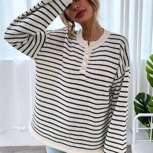 Black and White Preppy Womens Striped Drop Shoulder Button Front Sweater