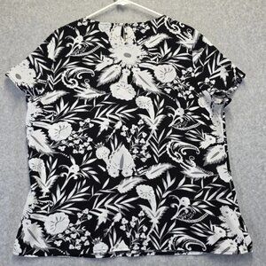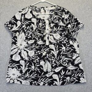This blouse features a striking black and white floral pattern, offering a relaxed fit perfect for warm weather. The lightweight fabric and buttoned style make it an ideal choice for casual outings.