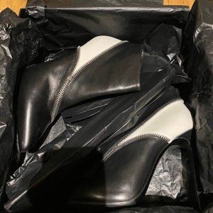 EUC Saint Laurent YSL Classic Paris 110 Two Tone Leather Ankle Booties in Black & White with Metal-Tone Hardware. These boots were worn one time, with no visible signs of wear. The soles have been protected with rubber soles from the renowned Leather Spa in NYC. They have been well maintained in a open air shoe closet. The original box, two shoe bags and packaging come with the booties.
