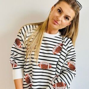 New with tags in original packaging. This striped rugby sweatshirt is a stylish choice for sports enthusiasts. Shiny sequins add a touch of whimsy to the football appliqués. Side slit for a very flattering fit. Light weight oversized sweatshirt. Boutique brand is true to size.