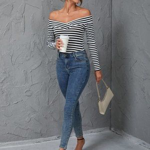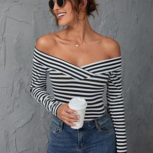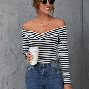 Black and White Sexy Womens Striped Print Off Shoulder Tee