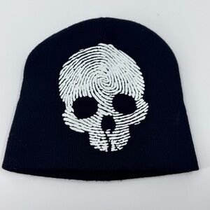 This striking knit beanie features a unique white skull design against a black background, crafted with a fingerprint pattern for a modern twist. Made from a cozy knitted fabric, it offers a snug fit to keep you warm and stylish. Perfect for adding an edgy touch to your accessory collection.
