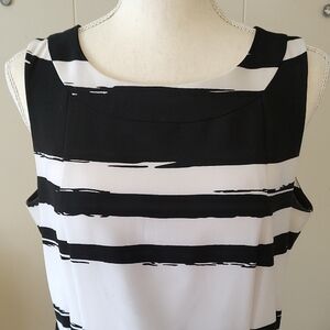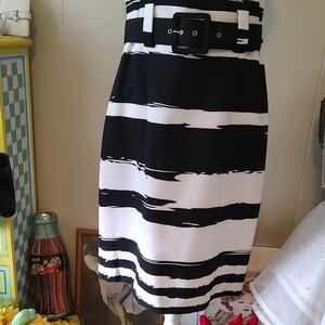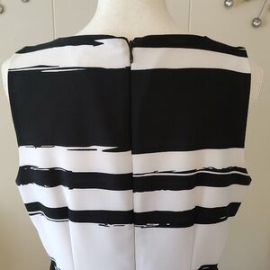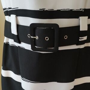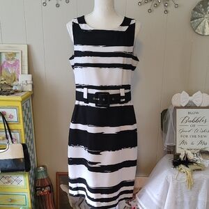 This striking black and white belted sheath dress features a sleeveless design and a sophisticated square neckline. The dynamic stripe pattern and fitted silhouette make it perfect for work or cocktail occasions. Its midi length adds a touch of elegance, ensuring you stand out with timeless style.