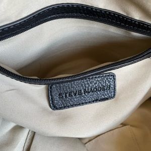 Black and white with gold hardware and gold zipper details. Approximately 11” tall and 17” wide. Can be used as large purse, small carry-on bag, or laptop bag. Has two handles and adjustable shoulder strap. One small stain on inside (pictured). Subtle snakeskin texture on white panel.