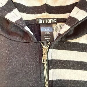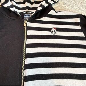 Stylish black and white striped hoodie with a zip-up front. Features a unique design with one solid black sleeve and one striped sleeve.