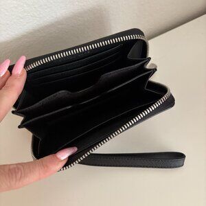 Stylish black and white striped wallet with a convenient wristlet. Features a metal logo plate on the front.