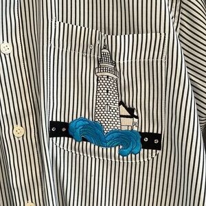 Are you ready to sailing or just take a walk by the beach. You need this beautiful black and white striped long sleeve blouse with lighthouse appliqué on the front and back. It is fabulous!