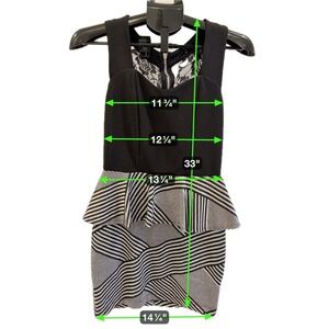 Keywords: peplum dress, black and white dress, striped dress, lace back, sleeveless dress, mini dress, cocktail dress, party dress, dress, women's dress, geometric print, statement dress, evening dress