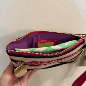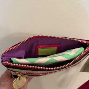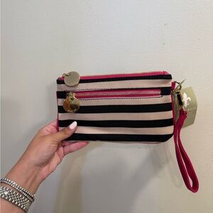 Stylish clutch featuring bold black and white stripes. Perfect for adding a chic touch to any outfit.