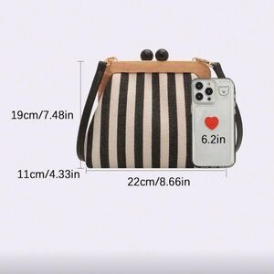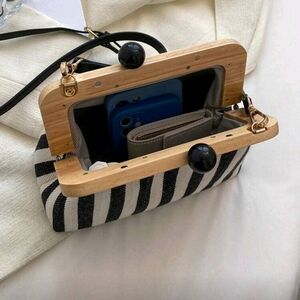 Stylish black and white striped purse with a unique wooden frame. Perfect for adding a touch of elegance to any outfit.