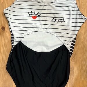 Stylish black and white striped leotard with fun cut out back with cute eyes. Perfect for dance or gymnastics ! Always hand washed