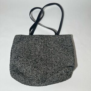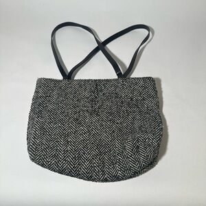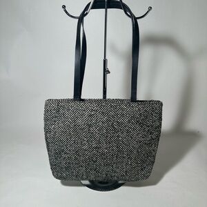 This elegant tote bag features a striking black and white design, crafted from a textured fabric that adds a sophisticated touch. Its spacious interior and long, sturdy handles make it perfect for everyday use, offering both style and functionality. The classic tote shape ensures it remains a timeless accessory for any occasion.