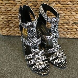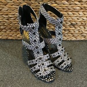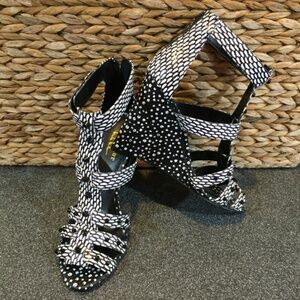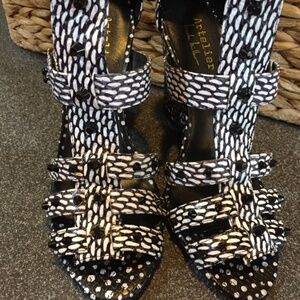 Step out in style with these chic black and white studded wedge leather sandals with zip back by Artelier Nicole Miller. Perfect for any occasion. EUC