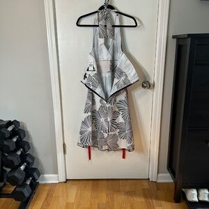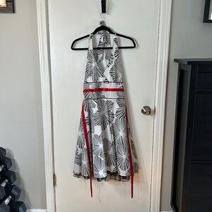 Black and White print halter midi dress with tie straps and zipper back. Red ribbon waist tie embellishment. Brand: City Triangles. Size: Juniors 13. 97% cotton 3% spandex. Lining 100% polyester. Material has no stretch. Brand new condition, never worn. Smoke-free pet friendly home. Questions? I will respond ASAP. Make me an offer!