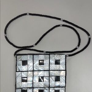 Stylish crossbody bag with black and white beaded and shell design Perfect for any occasion. Made in Vietnam. I think the manufacturer tag says Mod Collection… it’s hard to read and no way to get a proper picture. Smoke and pet free home. No missing shell pieces, or beads on strap. Super fun