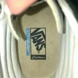 These vans have a saddle shoe type of look with a glitter stripe and leopard heel. No signs of wear