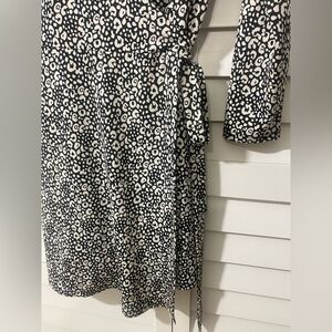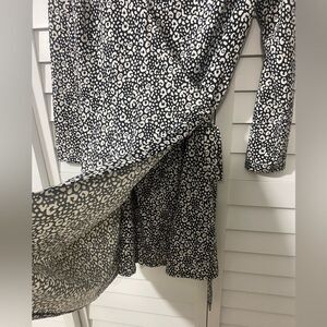 Elegant black and white print wrap dress perfect for any occasion. Features a flattering silhouette and comfortable fit.