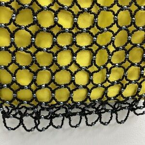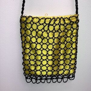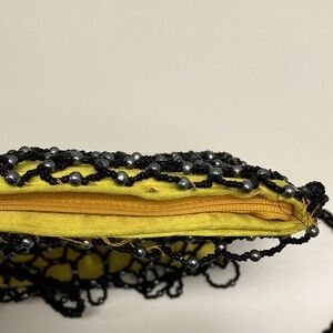Black and Yellow Beaded Satin Bag preowned. Top stitching next to zipper has come loose. Just needs a new small hand stitch. Beautiful beaded strap. Unique satin bag