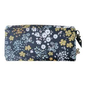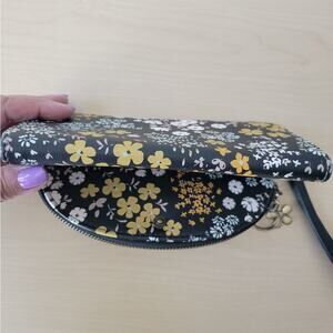 This elegant clutch features a striking floral pattern on a black background, accented with vibrant yellow blooms. Its compact design includes a convenient wrist strap, making it perfect for carrying essentials with ease. Ideal for adding a touch of sophistication to any outfit.
