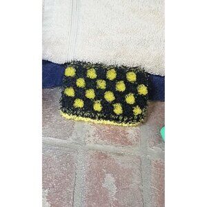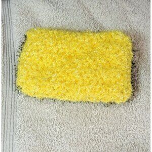 Beauty meets function in this handcrafted black and yellow kitchen scrubby. It is two-sided. One side is more abrasive than the other, so you can choose a deeper or lighter scrub. It’s very versatile to fit your needs and can be washed in the laundry, allowing it to be used over and over again. There is also a sponge inside to help hold lots of sudsy soap. Approximate measurements: 5 in x 3.5 in x 1.5 in.