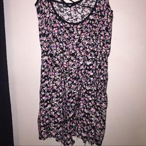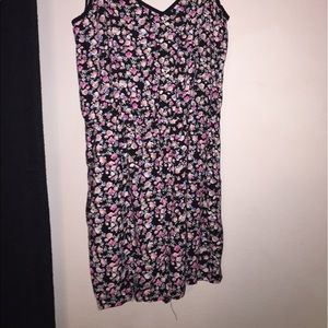 black floral romper with pockets! There is cross of straps in the back. Sinches at the waist. Straps are adjustable. V neck line. Very spring and pairs well with wedges. Worn twice. Looks brand new.!!