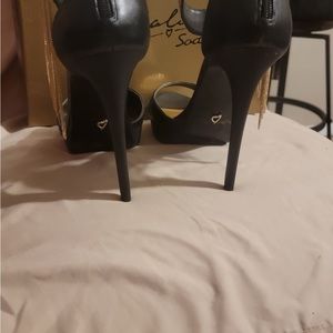 Black and gold Thalia Sodi platform heels with gold chain