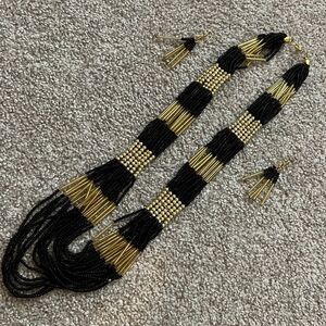 Unbranded. Necklace measures approximately 27-28 inches on shortest chain. Earrings hang approximately 2.5 inches long. Gold and black seed beads. Minor signs of aging on clasp