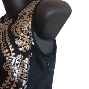 Great little party/ cocktail dress by Donna Ricco. Black with gold sequins, lined also. Size 2p.Side zipper, clasp in back. Perfect for office parties, date night, New Year's Eve.Good used condition, no flaws.