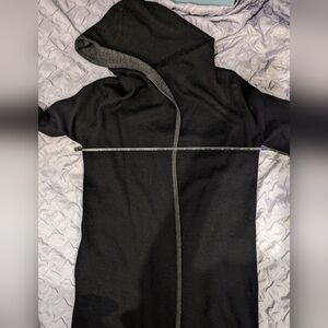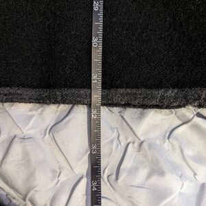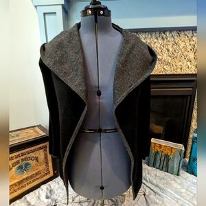 Black exterior, grey interior and hems. No buttons, just a cascading & flowing front. Falls below the bum, super comfy for keeping warm outside or cuddling up inside.