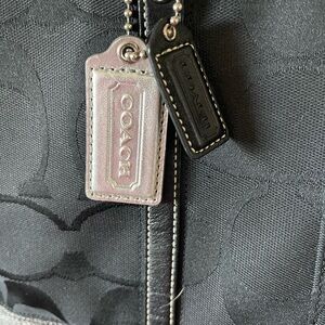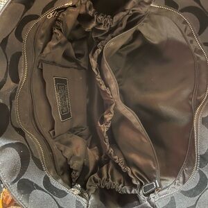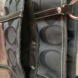 Black and silver Coach signature tote bag/diaper bag with lots of pockets.