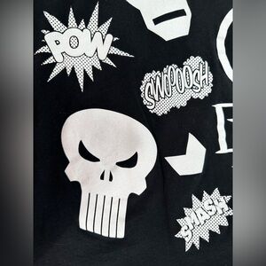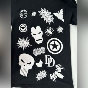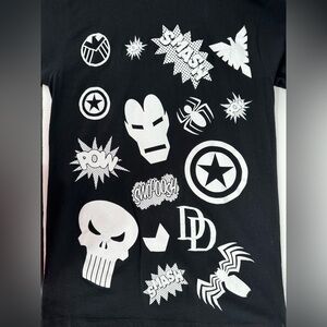 Black and white Marvel Avengers Unisex Graphic Tee. Features Iron Man, Hulk, Captain America, Shield, punisher, daredevil, etc. cute vintage style graphics. Size medium. Happy to give measurements upon request!