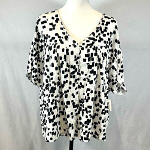 Black and white abstract print vneck pleated button front blouse top size 1X NWT