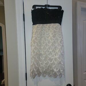 JS Collection. Black and white bodice style sequin peacock formal dress with bow.