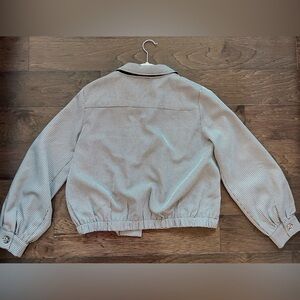 Houndsooth button down collared bomber jacket. Made out of 95% polyester and 5% spandex. Has a full lining and is made out of 100% rayon.