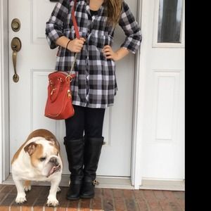My bulldog wanted to model in the first picture haha.. This top is a great one to wear with leggings and boots.. Has a V neck in the front (I'm wearing a black tank with it in this pic) and buttons down the rest.. Ties in the back .. Great condition and very comfortable.. Sleeves are three quarter length but the shirt has a button for the option of rolling it up to elbow length