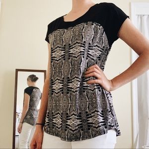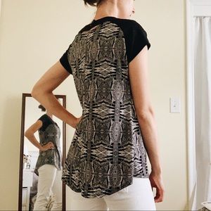 Size small - slightly stretchy material - drapes nicely, feels light to wear - 95% polyester, 5% spandex - slightly higher hemline in front than back - would best fit small to medium