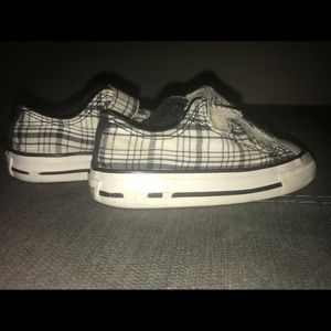 Black and white plaid converse. Double Velcro. A couple defects from wear. Wash up well.