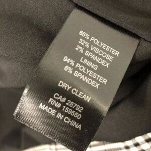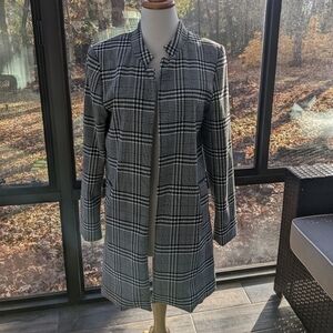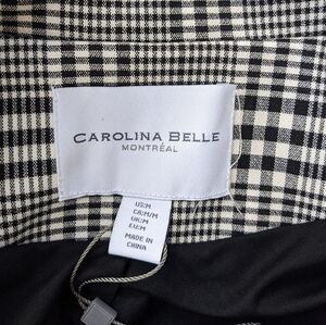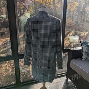 New jacket, size M from Carolina Belle. Black and white plaid with two pockets, fully lined. Buttonless style with stand-up, mandarin style collar. Length shoulder seam to bottom is 33”. Armpit to armpit 22”. Sleeves 24.5"