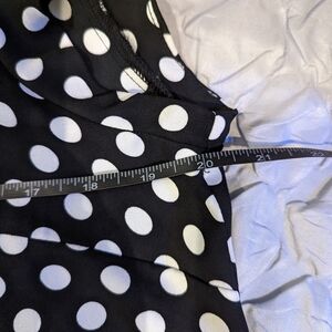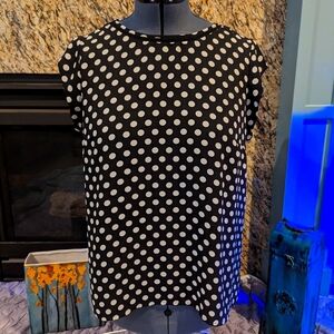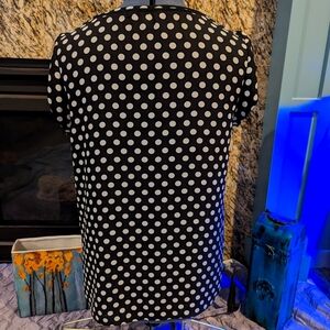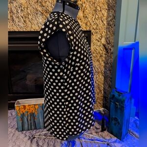 EGUC, black short sleeve poly blouse with white polka dots. Neckline and shoulders have a special open stitch as seen in pics.