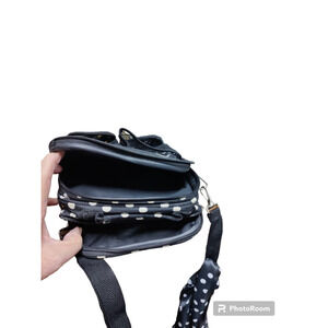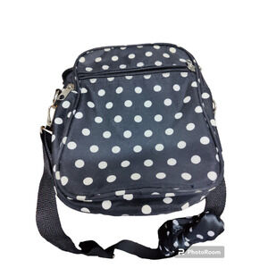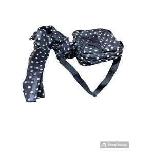 9 inches long, 6 inches wide and 2 inches depth, Black and White Polka Dot over the shoulder strap womens bag and comes with silk scarf to match. 2 deep inside pockets with outside zipper closure, another outside zippered pocket on back side and has a net pocket on front for cell phone and zippered smaller pocket for sunglasses. Slightly used but no defects, comes with over the shoulder strap that is adjustable.