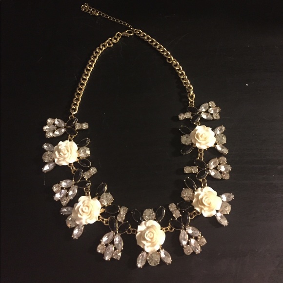Gorgeous necklace with black and rhinestone accepts that compliment the cream roses perfectly ! This is a conversational piece!