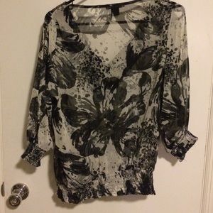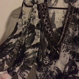 Keyhole openings at shoulder to elbow. Elastic at waist. Sheer top with sparkles and sequins around the v-neck collar. Worn once.